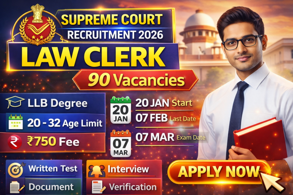 Supreme Court of India (SCI), New Delhi has released an official recruitment notification on its official website for the post of Court Law Clerk. This recruitment drive is being conducted for a total of 90 vacancies. The Supreme Court online application process started on 20 January 2026, and eligible candidates can apply online until 07 February 2026. As per the eligibility criteria, the minimum age limit is 20 years and the maximum age limit is 32 years, calculated as on 07 February 2026. Candidates are advised to carefully check the complete notification, including eligibility conditions, age limit, selection process, and application instructions, before applying for the Supreme Court Law Clerk Recruitment 2026, the full details of which are provided below.